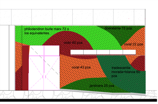 Recibe al usuario con una combinación de follajes de colores vivos, amarillos, morados y naranjas aportados por las dos variedades de crotos y por las tradescantias péndulas. El verde de los philodendros burle-marx y de la rusellia (coral), sirve de contraste. Tambien se eligieron follajes que aportan texturas visuales contrastante.