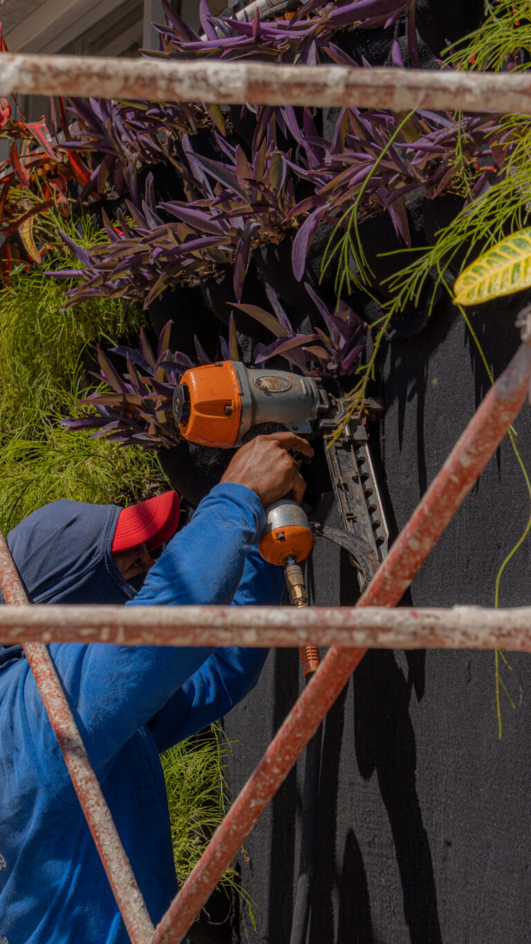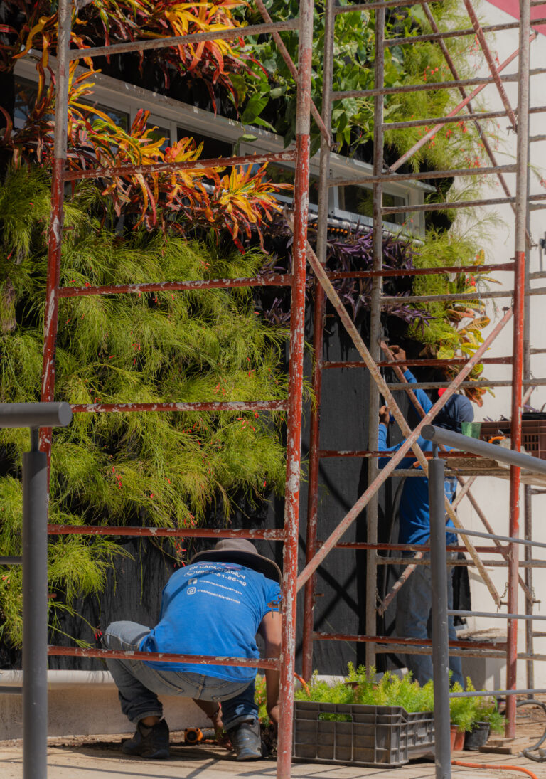 El jardín vertical enmarca el acceso desde el campus de la Universidad al edificio de ciencias de la Salud, abarcando un area de 24 m2 y una altura de aproximadamente 4 m.